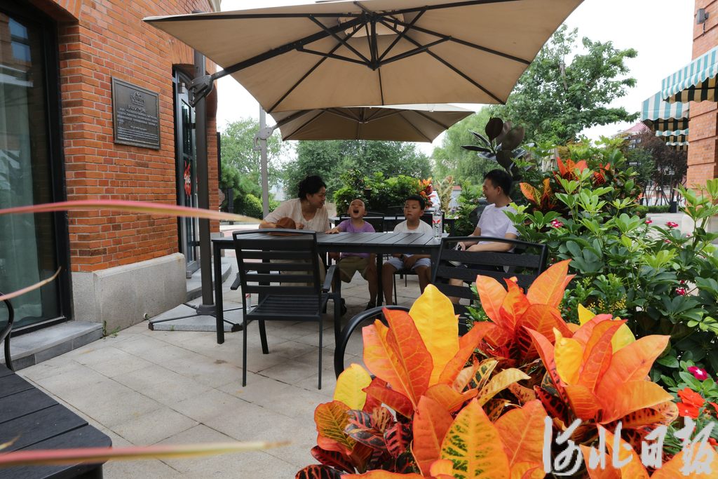 8月1日,游客在唐山市路北区培仁历史文化街的一家饮品店前休息。 河北日报记者 王育民摄